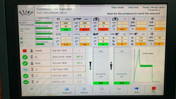 Основные параметры измерения: тест на герметичность, тест объема при полной нагрузке, среднюю скорость, тест на холостом ходу, тест на предварительном впрыске. (Leak, VL, EM, LL, VE)